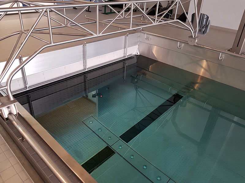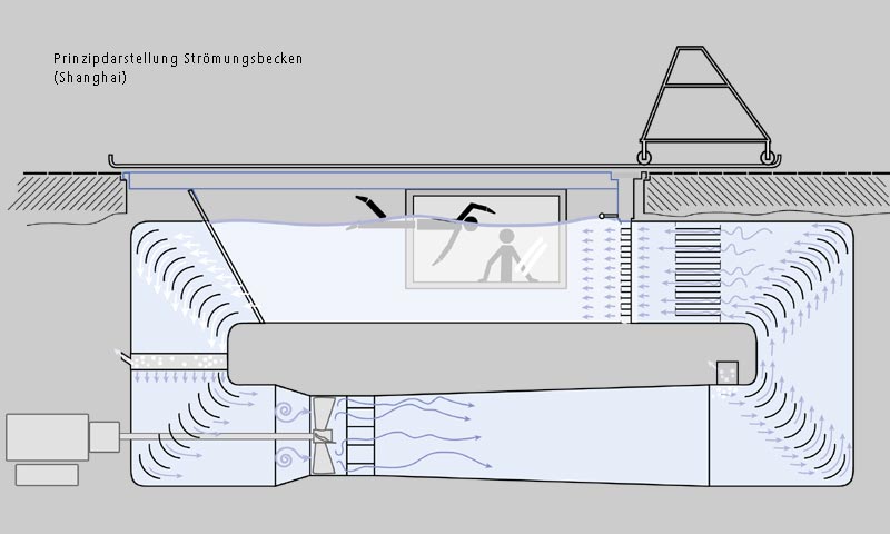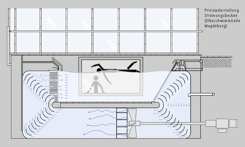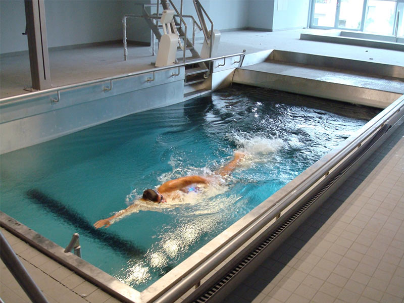 Гидроканалы для плавания используются, в частности, для проведения тренировок и диагностики в профессиональном и любительском спорте. Представленная на изображении версия гидроканала позволяет достигать скорость потока воды вплоть до 2,5 м/с. Помимо всего прочего, он оборудован специальным подводным иллюминатором, и/или цифровыми камерами с аппаратурой воспроизведения. Оборудование позволяет осуществлять спироэргометрические исследования пловцов во всех плавательных дисциплинах вплоть до скоростей мировых.