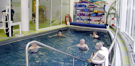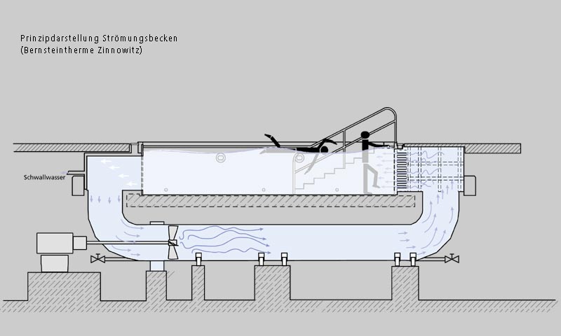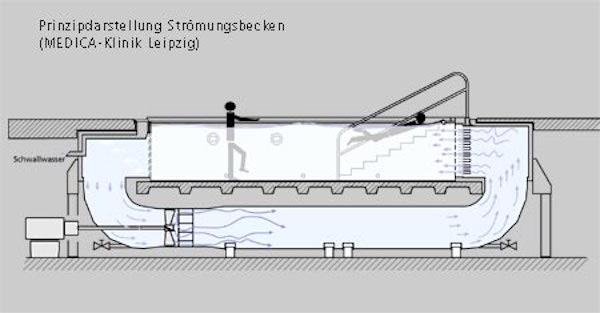 Гидроканал для проведения терапии, реабилитации и предупреждения заболеваний особенно подходит для стационарных и амбулаторных реабилитационных учреждений. Особенно действенна система “Sreaming in”. Это означает, что имеются небольшие зоны отдыха, расположенные в правой и/или левой частях бассейна, позволяя пациенту таким образом немного передохнуть, не выходя из воды. Выдвижные лестницы и ступеньки, поручни, подъемные устройства и другие вспомогательные средства позволяют осуществлять обслуживание пациентов с серьезными физическими расстройствами, а также тех, кто не умеет плавать.