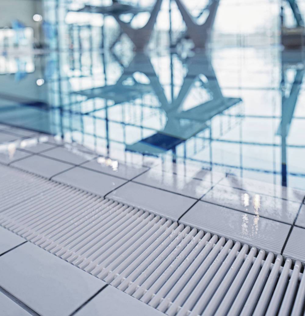 Переливные решетки emco используются, как в общественных, так и в частных бассейнах и хорошо поглощают переливающуюся из бассейна воду. Они кладутся параллельно или поперечно кромке бассейна и могут быть изготовлены под любую форму бассейна: свободную, джакузи или прямоугольную.