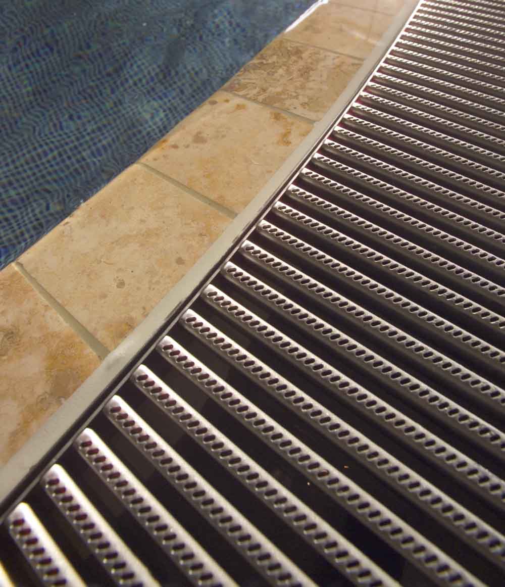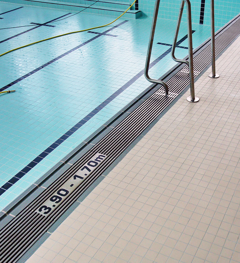 Исходя из жесткой конструкции, чтобы избежать раскачивания решеток, мы предлагаем использовать переливные решетки с подходящими соответствующими рамами. Специальные рамы предлагаются и для оснащения уже готовых керамических бассейнов.