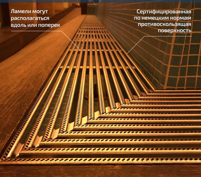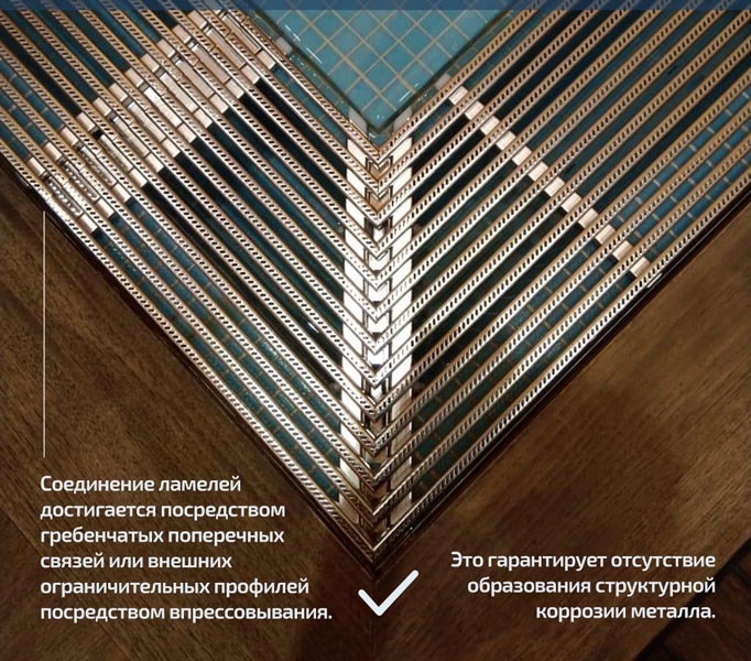 Ламели могут располагаться вдоль или поперек, промежуток между ламелями можно варьировать (стандартно 8мм). Они имеют сертифицированную по жестким немецким нормам противоскользящую поверхность. Соединение ламелей достигается посредством гребенчатых поперечных связей или внешних ограничительных профилей посредством впрессовывания, что гарантирует отсутствие образования структурной коррозии металла. В качестве особого исполнения предлагаются изогнутые варианты, с косыми срезами. Среди комплектующих и принадлежностей доступны рамы, крепежные накладки, крепежные элементы, подконструкции, кронштейны и т.п.