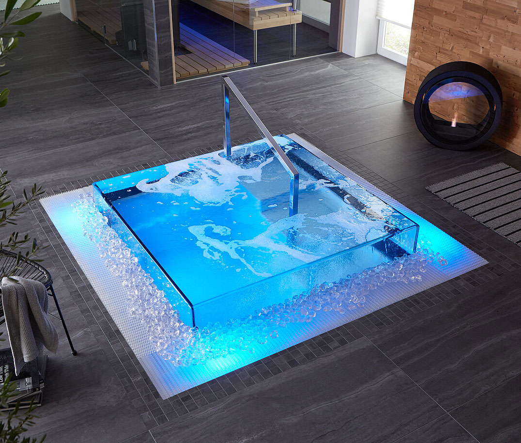 «Воздух и волна» — две дюзы Вентури с подмесом воздуха из технического помещения, насос 0,75 кВт-230 В и 2 всасывающих устройства в ванне, без подключения.