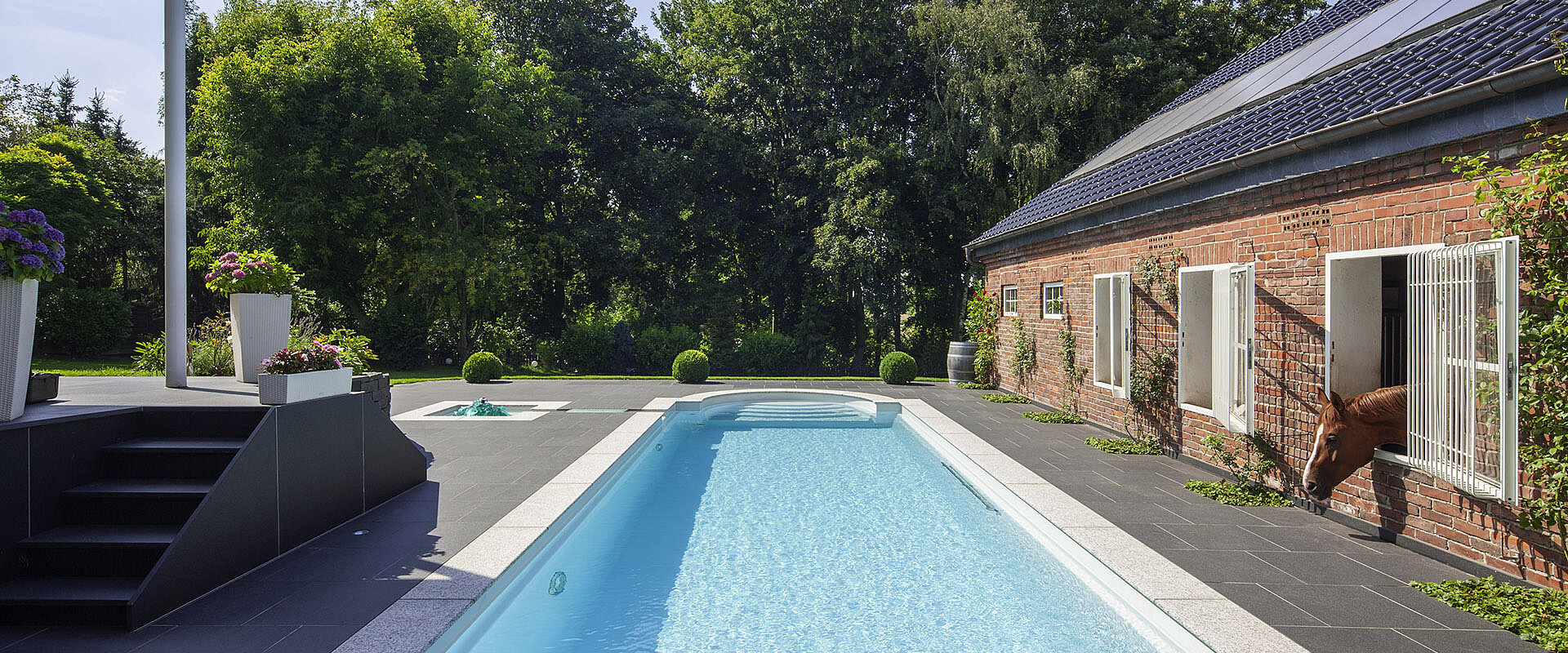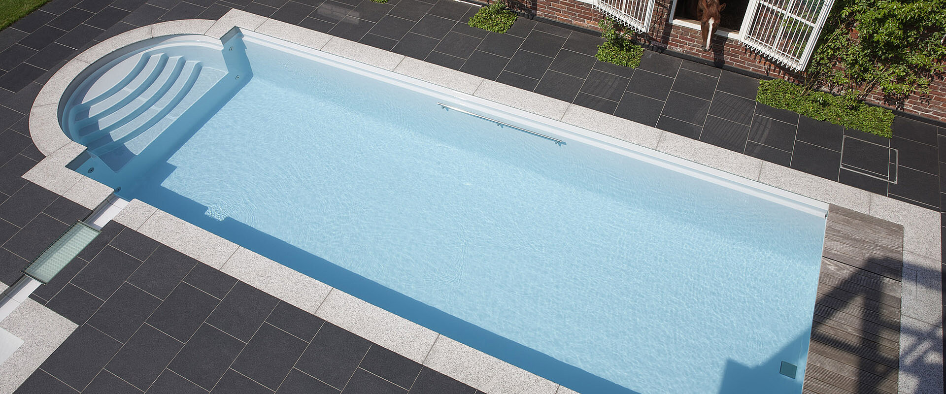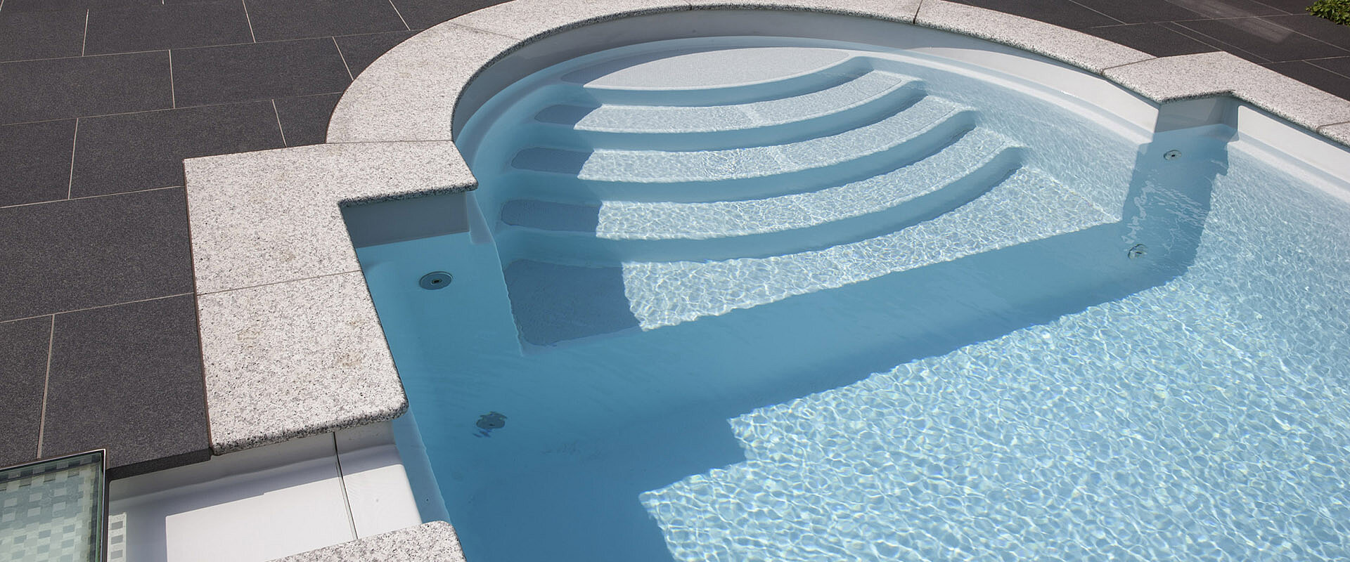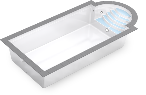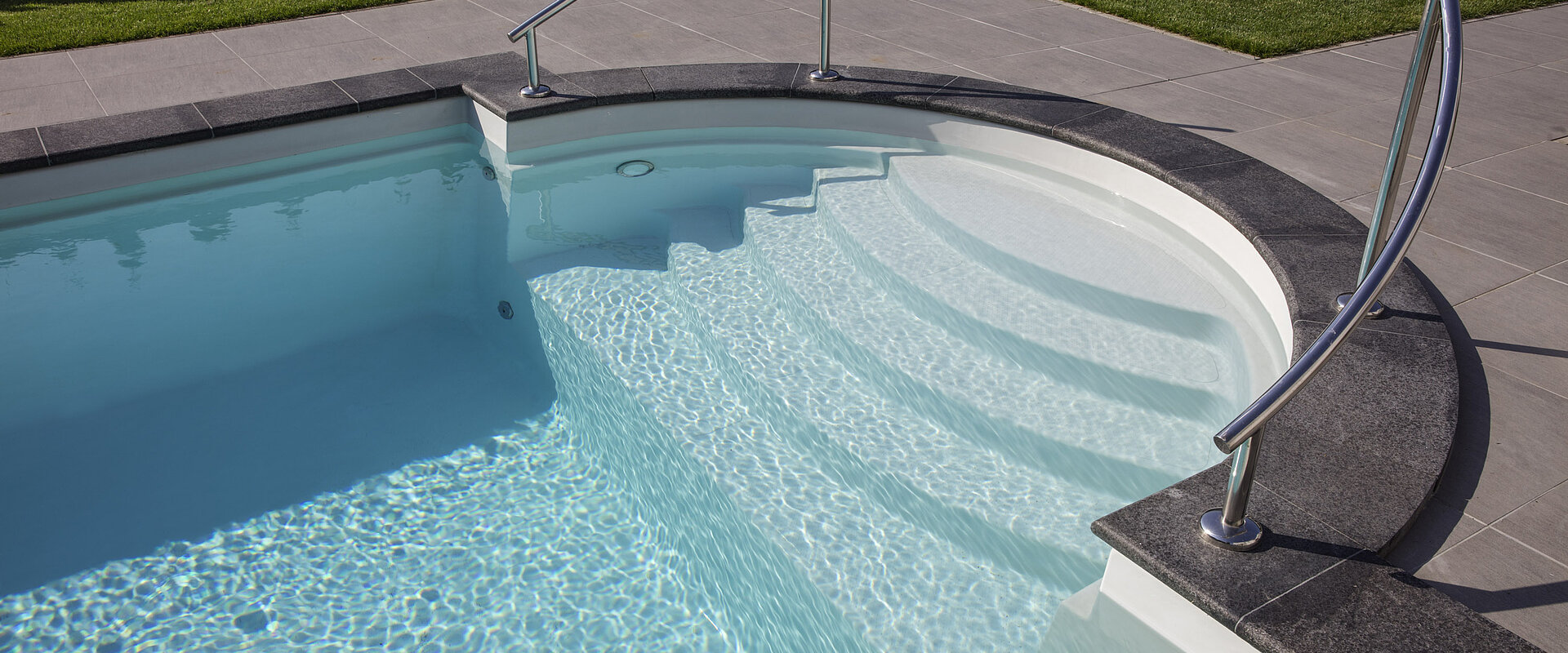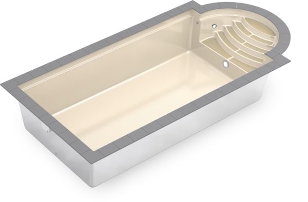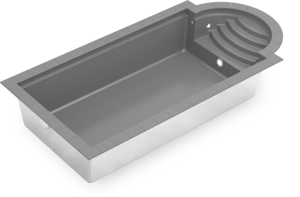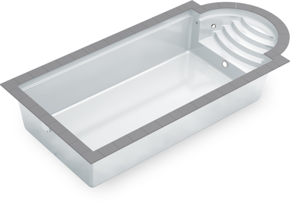Традиционный композитный бассейн с большой лестницей в римском стиле — это пять противоскользящих ступеней и элегантные поручни из полированной нержавеющей стали.