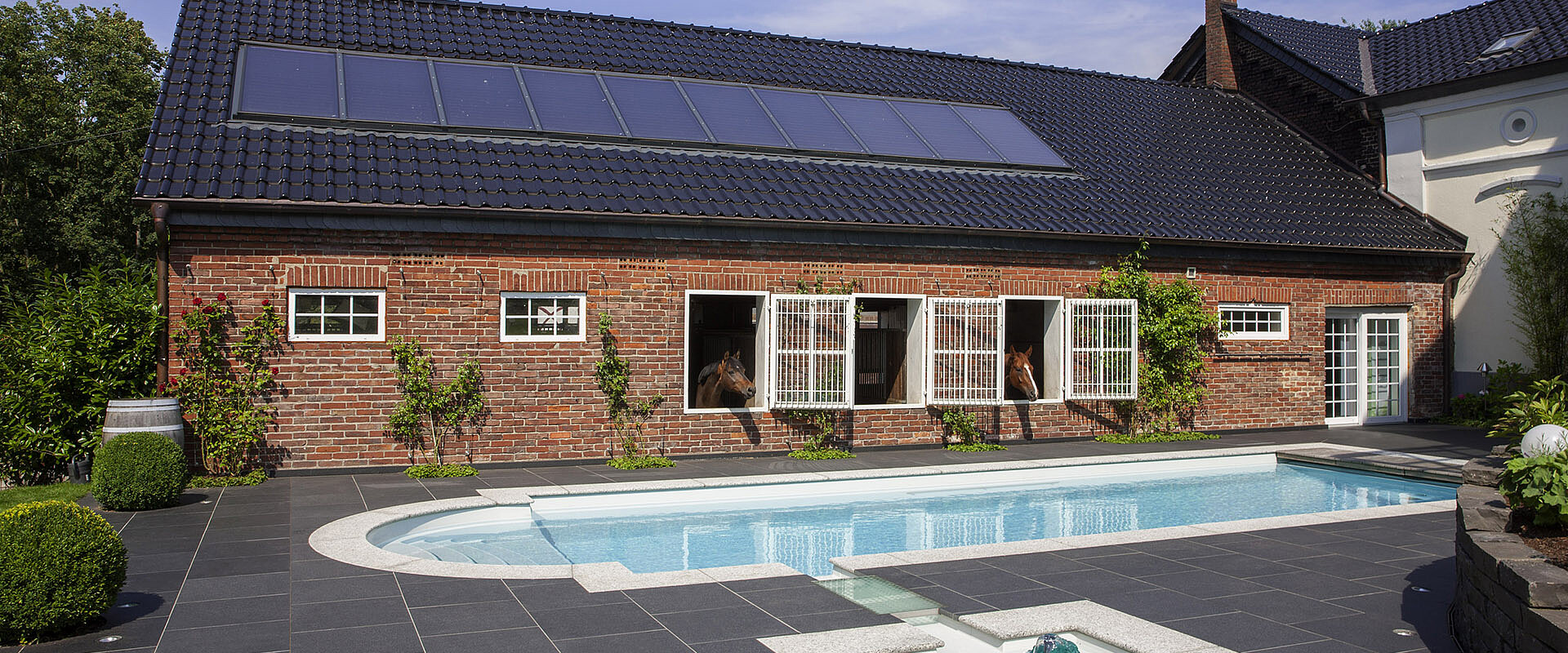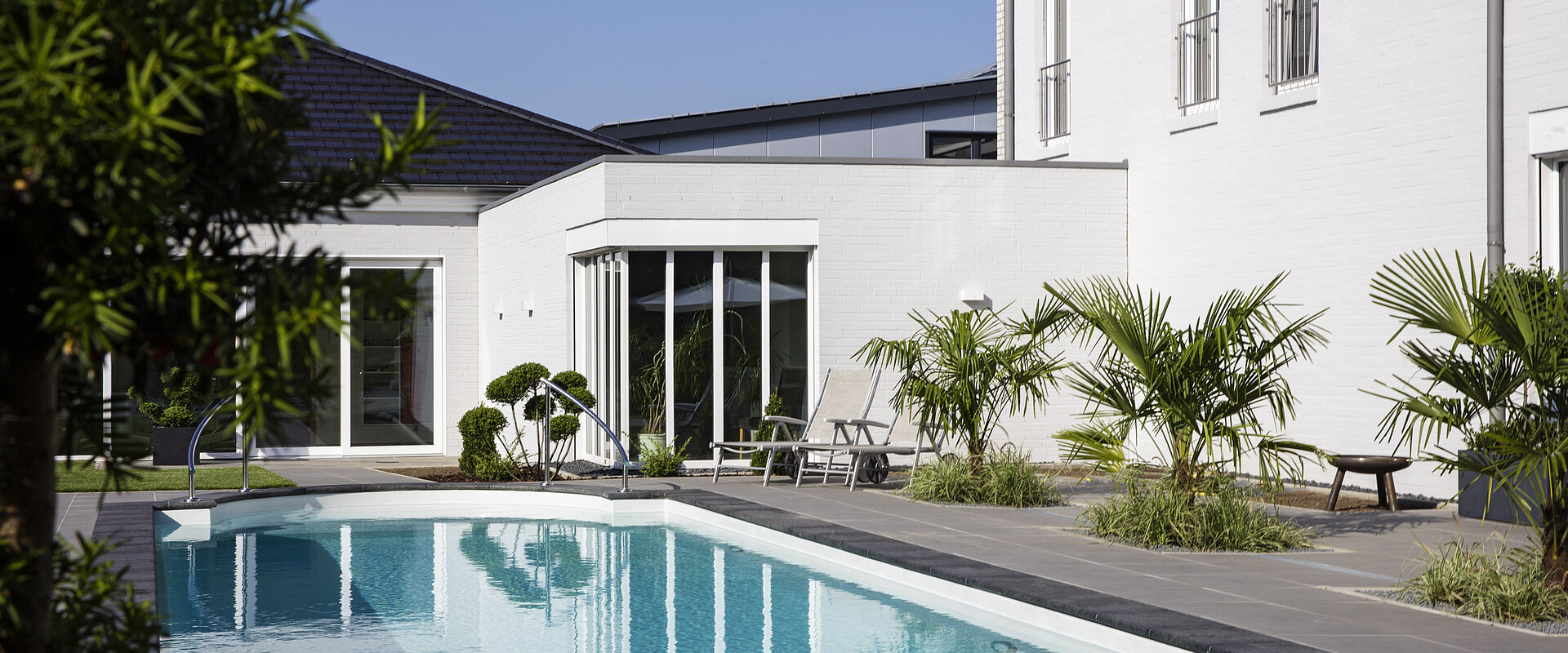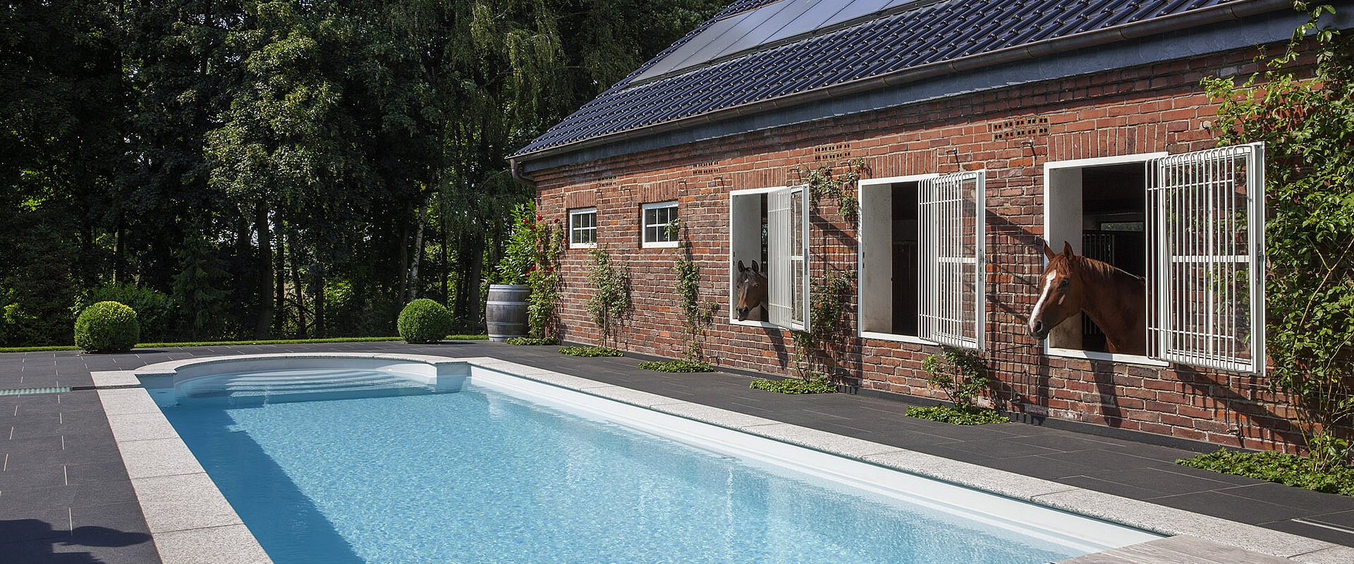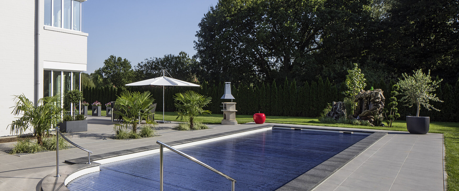 Традиционный композитный бассейн с большой лестницей в римском стиле — это пять противоскользящих ступеней и элегантные поручни из полированной нержавеющей стали.
